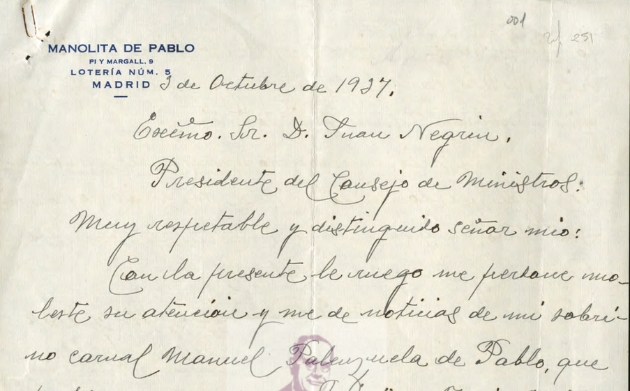 Un documento del Archivo Negrín revela que “Doña Manolita” pidió ayuda a Negrín durante la guerra