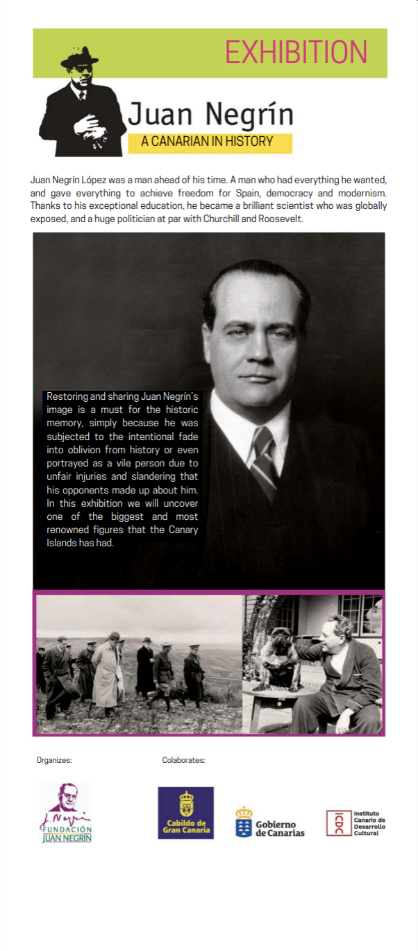 La Fundación Juan Negrín pone a disposición de los centros educativos y de la asociaciones interesadas la Exposición «Juan Negrín UN CANARIO EN LA HISTORIA» que puede visitarse de forma permanente en la Fundación.