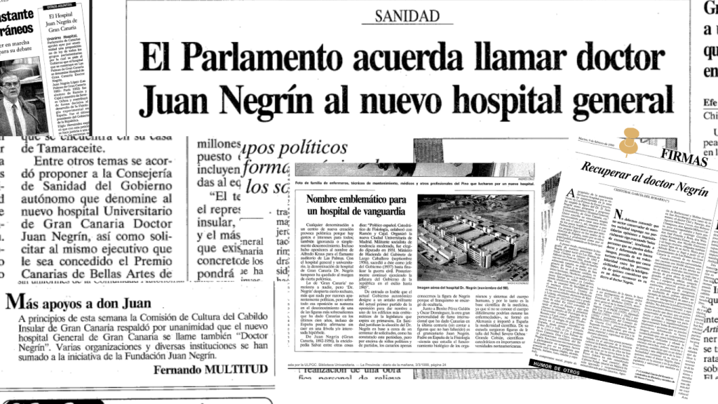 La culminación del Hospital Universitario de Gran Canaria Doctor Negrín, un hito extraordinario para la sanidad canaria, supuso también un salto de gigante en la tarea de recuperar la figura de quien fuera presidente del gobierno de la 2ª República durante los últimos años de la guerra de España, el canario Juan Negrín López (Las Palmas de Gran Canaria, 1892 – París, 1956).